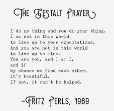 На крајот, ќе ви ја презентирам гешталт молитвата која навидум изгледа себична, но носи длабока филозофија на живеењето. Вели: